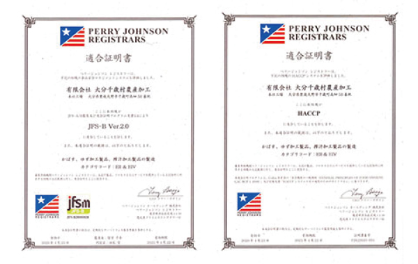 当社のかぼす・ゆず加工製品、搾汁加工製品は、2020年4月に、日本発・国際レベルの食品安全管理規格であるJFS-B規格(カテゴリ:EⅡ、EⅣ)、 製造工程における衛生管理基準HACCP(ハサップ)の適合証明を取得しました。